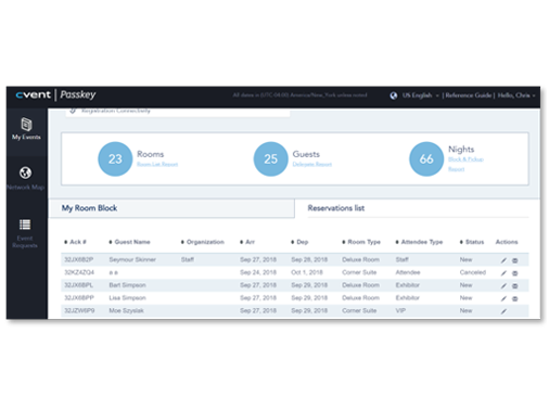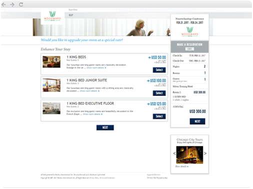 Automatische Bewerbung und Verkauf von Zimmer-Upgrades, Aufenthaltsverlängerungen, Annehmlichkeiten und Extras auf konfigurierbaren Webseiten. Sie können das Absage-Risiko reduzieren und sicherstellen, dass Gäste innerhalb des Raumblocks des Events buchen.